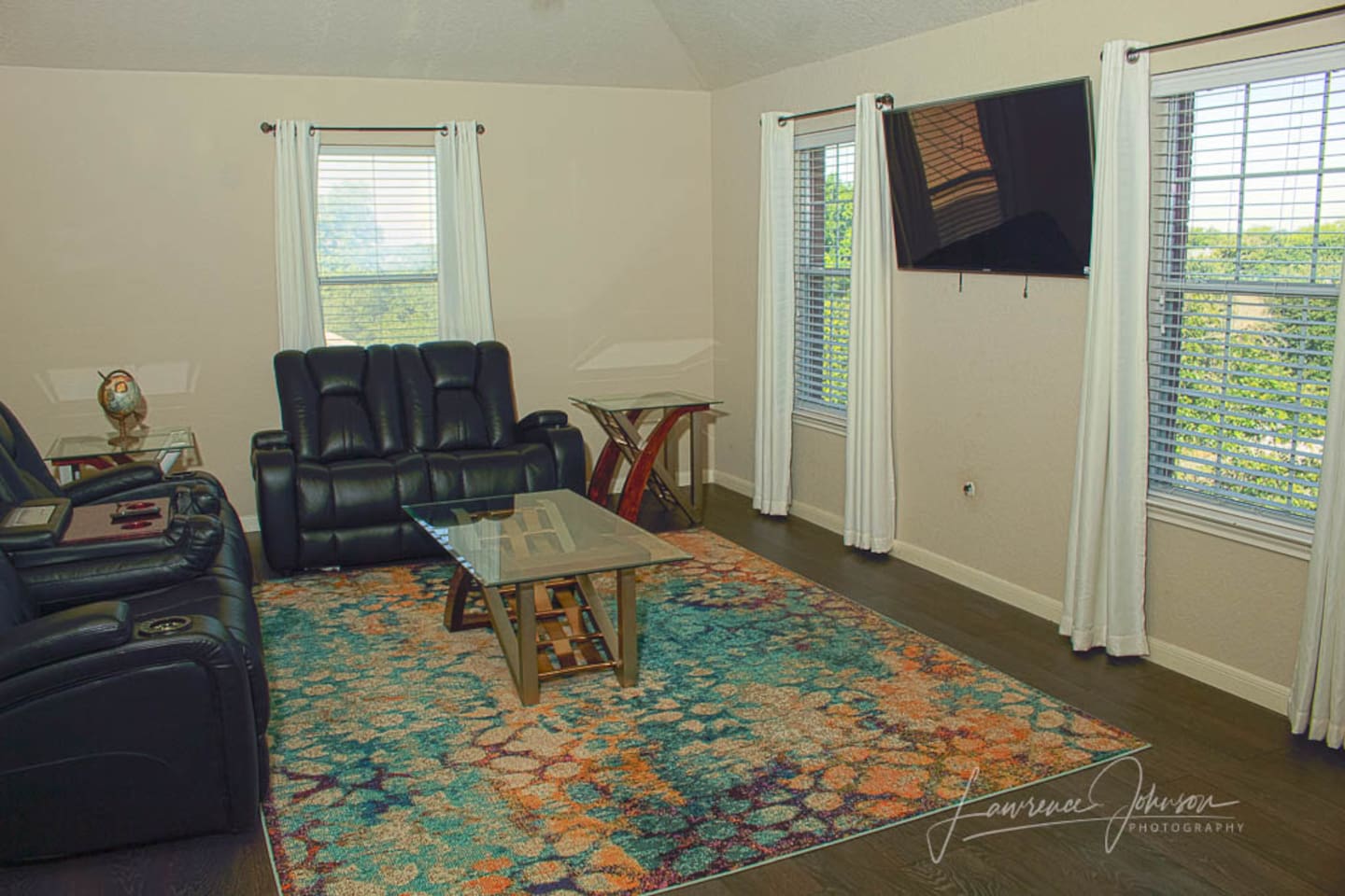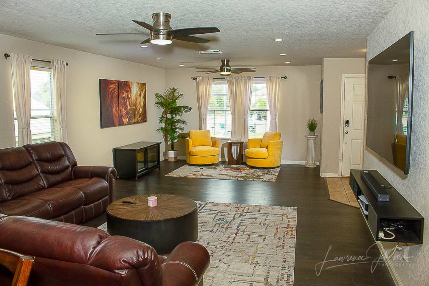 The home features two AC units with built-in air purification and Alexa-enabled devices that control TVs, lighting, and climate settings. Amazon Music and SiriusXM are available on all Alexa devices, and every TV includes premium channels.